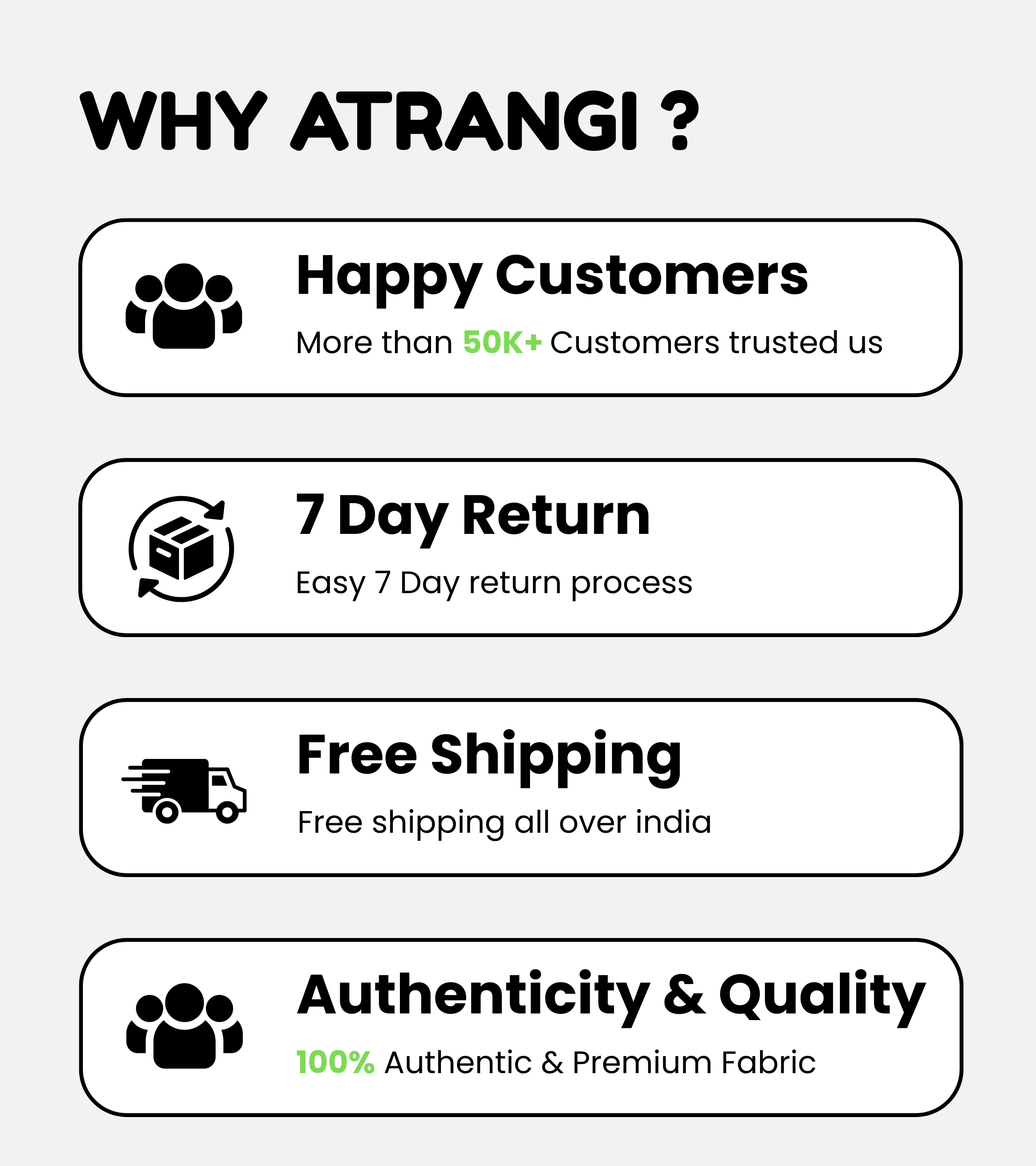 • Damaged/Incorrect: Report within 24 hrs via WhatsApp / Instagram / support@atrangi.com for free replacement/refund.